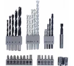 В состав набора входят спиральные сверла по дереву, металлу и камню, а также разнообразные насадки-биты с формами наконечников PH, PZ, SL и TX. Для расширения функциональности предусмотрены магнитный держатель, зенкер, переходник и торцевые ключи. Все элементы выполнены из прочных материалов, устойчивых к износу и обеспечивающих долговечность работы.