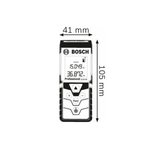 Bosch GLM 40 Professional запоминает до 10 последних измерений, что облегчает выполнение последовательных расчётов. Устройство питается от двух батареек типа AAA, которых хватает более чем на 5000 измерений.