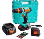 Комплект включает два литий-ионных аккумулятора ёмкостью 2 А·ч, импульсное зарядное устройство (зарядка 50–60 мин) и пластиковый кейс для хранения и транспортировки.