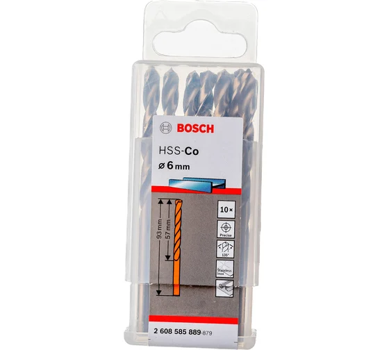 Сверло по металлу Bosch HSS-Co Standardline 6×93 мм (2608585889) предназначено для сверления легированной и нелегированной стали с пределом прочности до 1000 Н/мм², нержавеющей, кислотостойкой и жаростойкой стали, а также серого чугуна. Оснастка изготовлена из быстрорежущей стали с содержанием 5% кобальта (HSS-Co), что придаёт инструменту повышенную износостойкость, термостойкость и долговечность при работе с твёрдыми материалами.