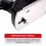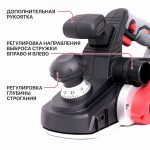 Парковочная «пятка» на подошве позволяет безопасно устанавливать рубанок, не повреждая поверхность заготовки, ведь ножи не касаются материала. Возможность регулировки направления выброса стружки влево или вправо добавляет удобства при работе в разных условиях.