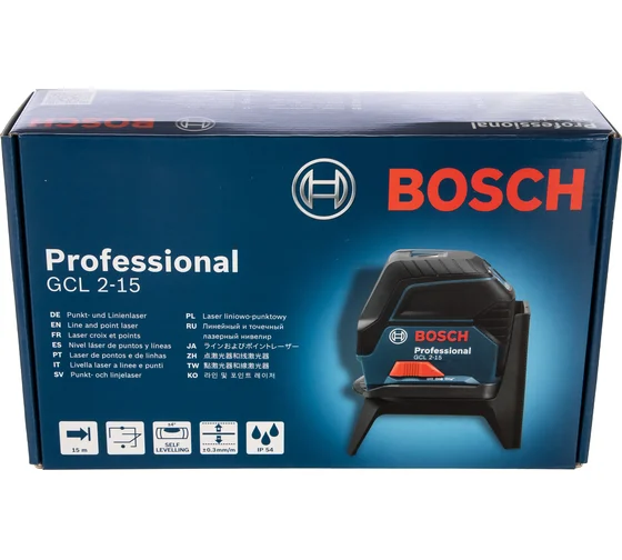 Лазерный нивелир Bosch GCL 2-15 Professional проецирует одну горизонтальную и одну вертикальную линию, а также две точки. Автоматическое выравнивание в пределах ±4° и защита корпуса от пыли и влаги обеспечивают точность и долговечность прибора. Универсальный держатель RM1 позволяет центрировать лазерные линии и использовать различные варианты крепления.