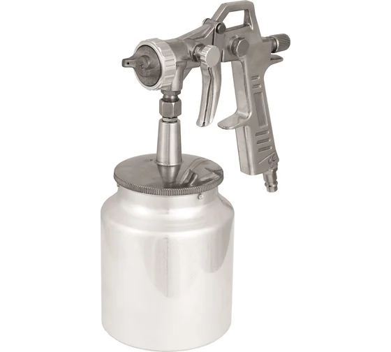 Корпус инструмента выполнен в эргономичной форме пистолета, что обеспечивает удобный захват и точное управление при распылении. Все основные регуляторы расположены рядом с рукояткой, позволяя быстро и удобно настраивать подачу воздуха и краски во время работы.