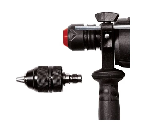 Перфоратор оснащён быстросъёмным патроном SDS-Plus — оснастку можно заменить одним движением руки. В комплект входит дополнительный кулачковый патрон для стандартных сверл.
