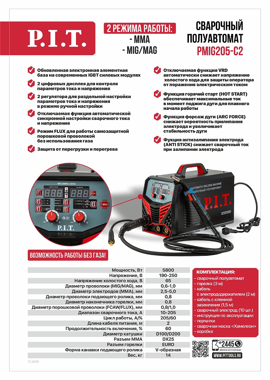 Универсальный инверторный сварочный полуавтомат PMIG205-C2 предназначен для выполнения двух типов сварки: