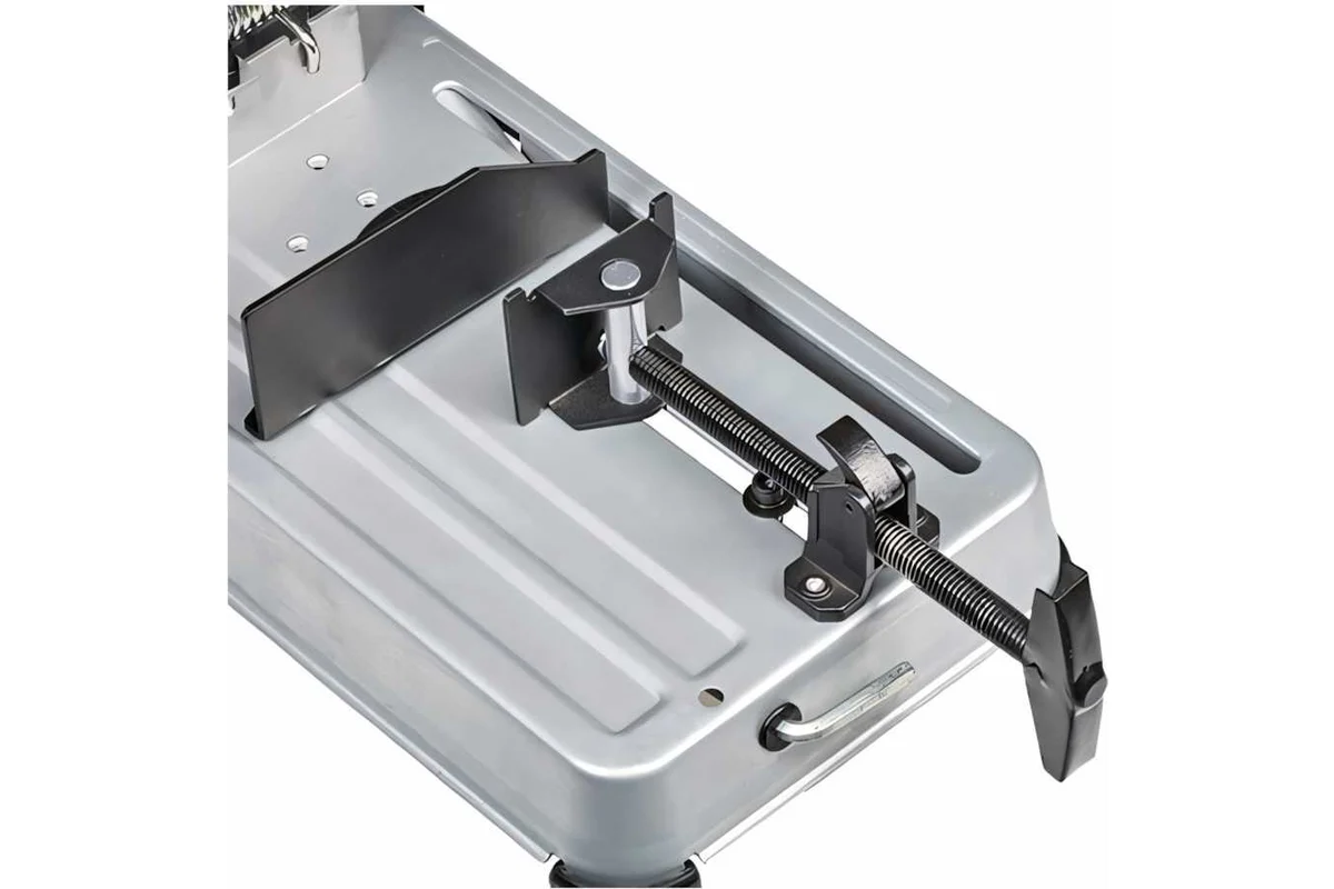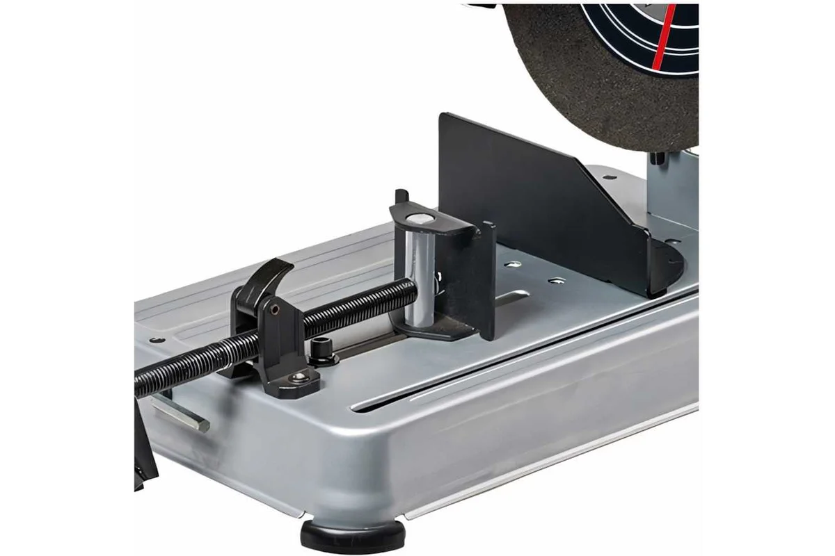 Тиски с быстрозажимным механизмом надежно фиксируют заготовку под углом от 0° до 45°, что упрощает выполнение косых резов. Защитный кожух эффективно предотвращает разлет искр, а транспортная ручка и фиксирующая скоба обеспечивают удобство переноски и хранения.