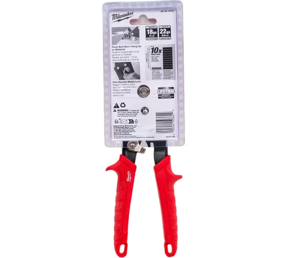 Технические характеристики Milwaukee 48224510: тип — левый, длина — 260 мм (10 дюймов), диэлектрическое покрытие — отсутствует, максимальная толщина реза — 1 мм, материал губок — сталь, рукоятки — обрезиненные красного цвета, длина режущей кромки — 31 мм. Класс товара — профессиональный, вес — 0,43 кг.